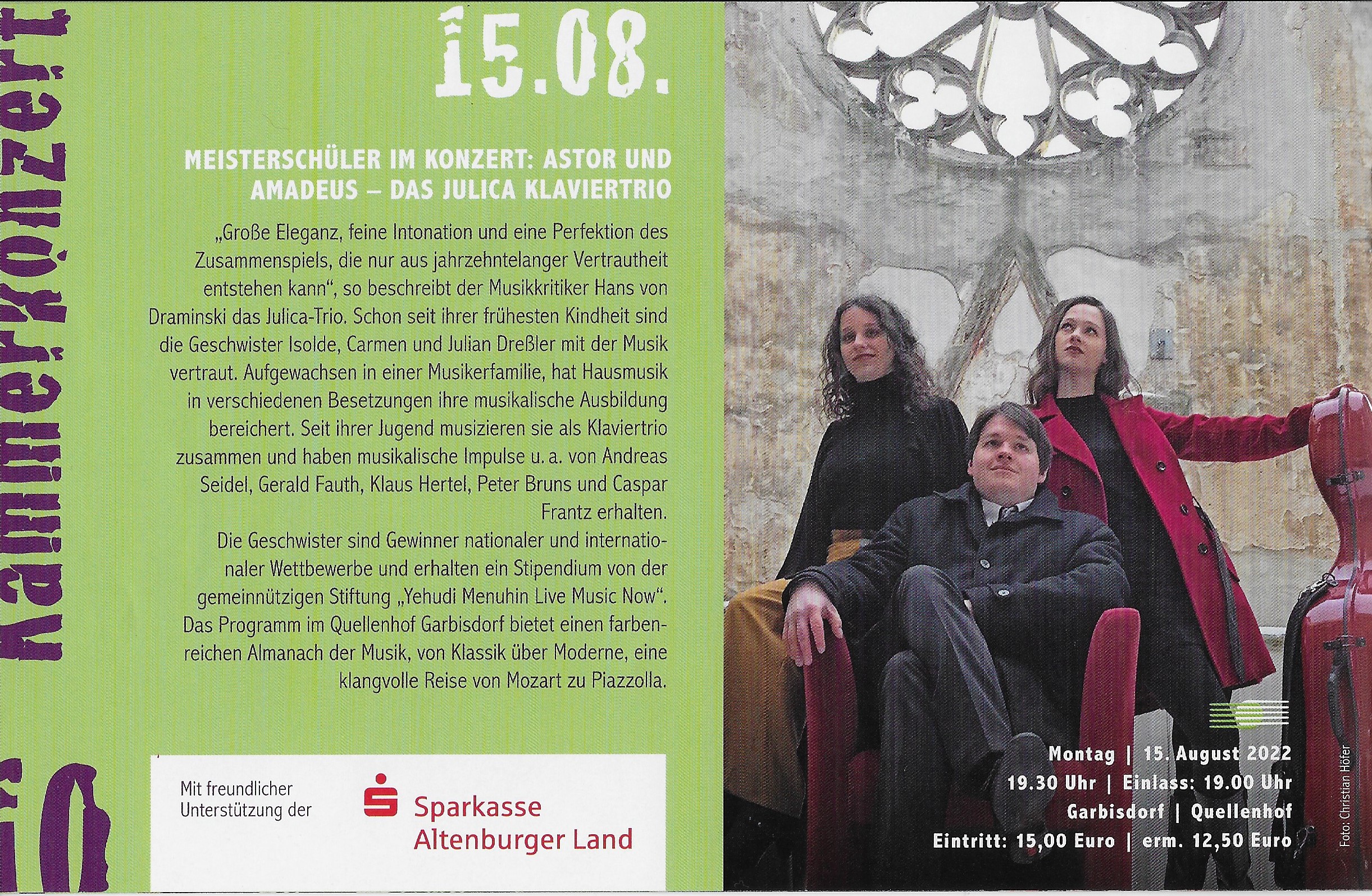 Altenburger Musikfestival am 15.08. um 19 Uhr Am 15. August macht das Altenburger Musikfestival Station am Quellenhof. „Meisterschüler im Konzert“ Das Julica Klaviertrio
